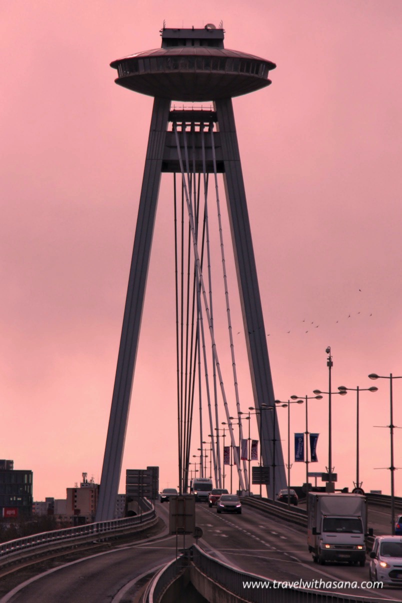 Most Slovenského národného povstania or briefly called as Most SNP was constructed from 1967 to 1972. It has 430 m length, 21 m width, and 84 m height. There are four lanes on this bridge with two lanes on the upper for motorised vehicle and two lines on the bottom for bycicle and pedestrians. Visitor can go up to the observation deck to enjoy the view of Bratislava. The east pillar used as lift and west pillar used as emergency stair as many as 430 stairs. Restaurant on the top named UFO Restaurant. (source: Wikipedia)
