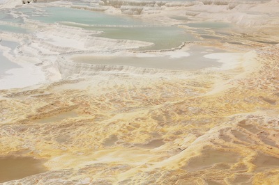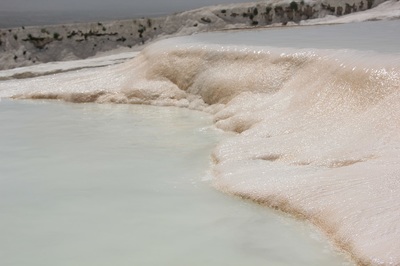 How can it be so white and what happened to the terraces? that were the first questions that popped up in my mind immediately. Well, here’s the short version of the history. Along time ago, there was this shifting of a fault, along with this shift came out the hot spring with high mineral content. There are about 17 hot springs in the area that emerges and flowing to the lands and deposit calcium carbonate. When the water with this mineral touch the surface, the carbon-dioxide is released and Calcium Carbonat is deposited, which over the time will be harden and turn to travertines. Until now, the flowing of the water is controlled and only to certain area.