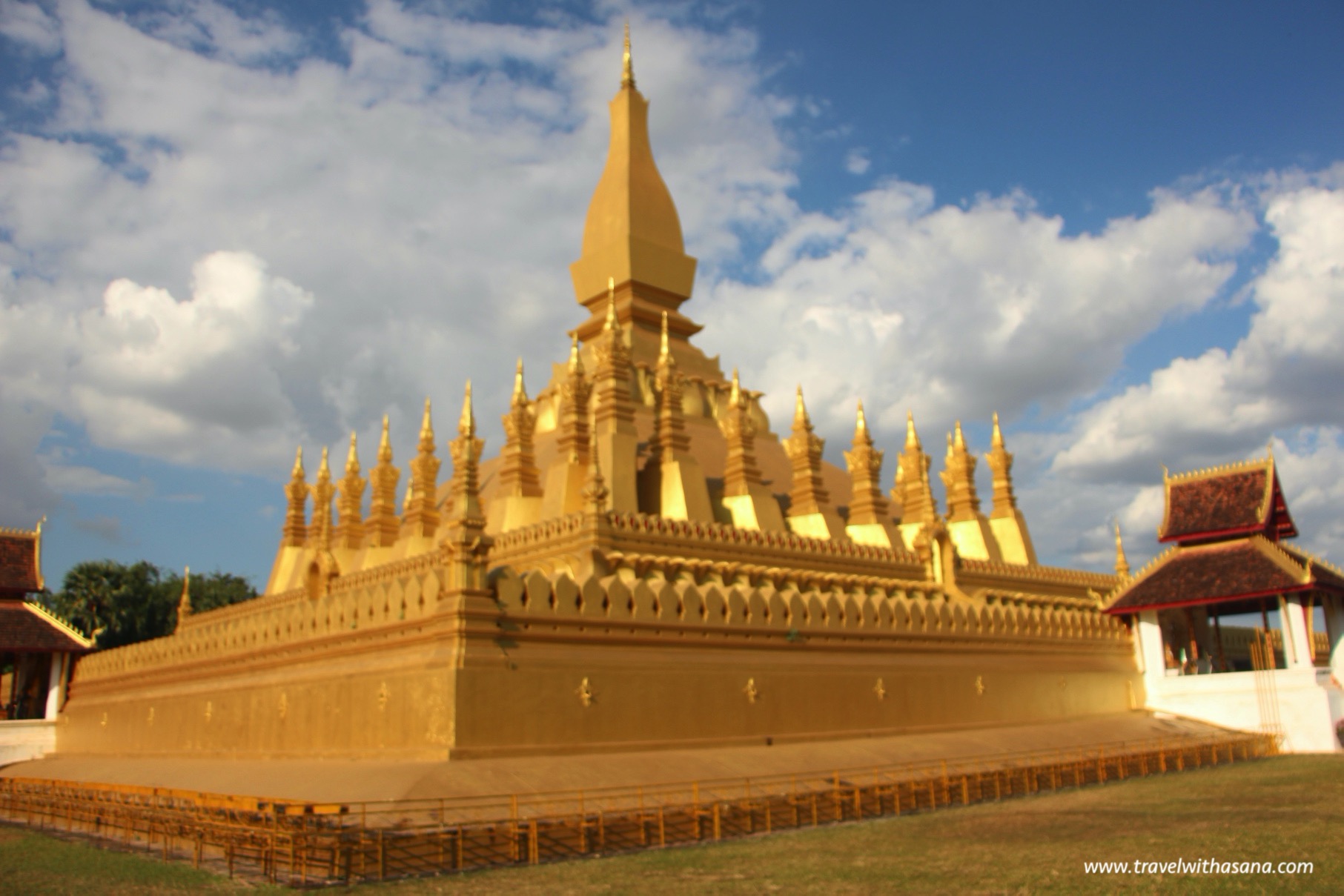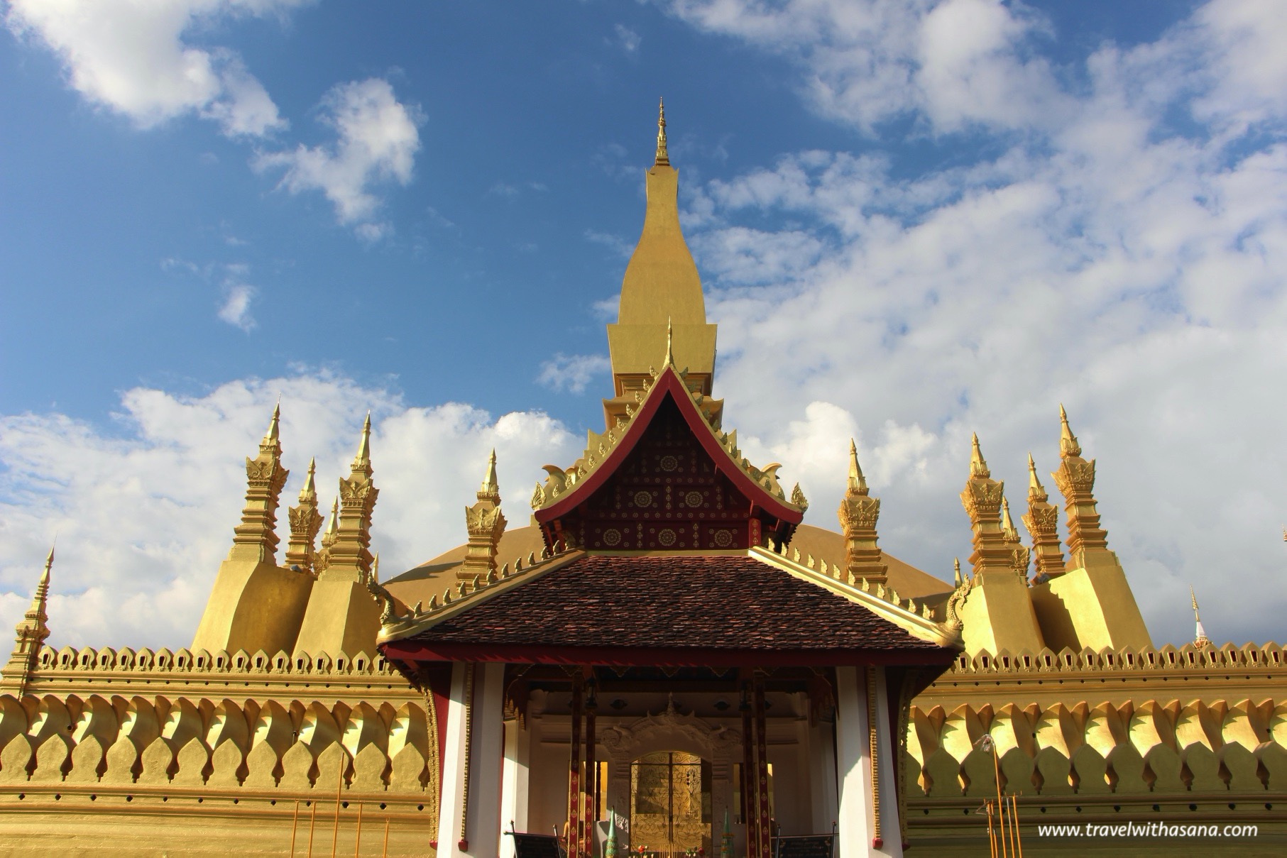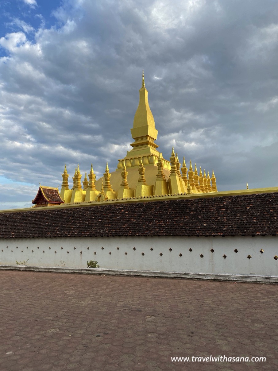 Phat That Luang is gold-covered Stupa in Vientiane. It is believed to be built as early as in the 1st century as Hindu Temple. This golden stupa is believed to enshrine a breast bone of the Buddha. The stupa today consists of three levels, each conveying a reflection of part of the Buddhist doctrine. The Pha That Luang consists of three levels. On top of the first level wall are hundreds of sema stones that mark the sacred area. At the center of each side of the wall is a prayer gate called Haw Wai, an open structure with a double roof containing a Buddha image. The stairs to it are guarded by Naga snakes.